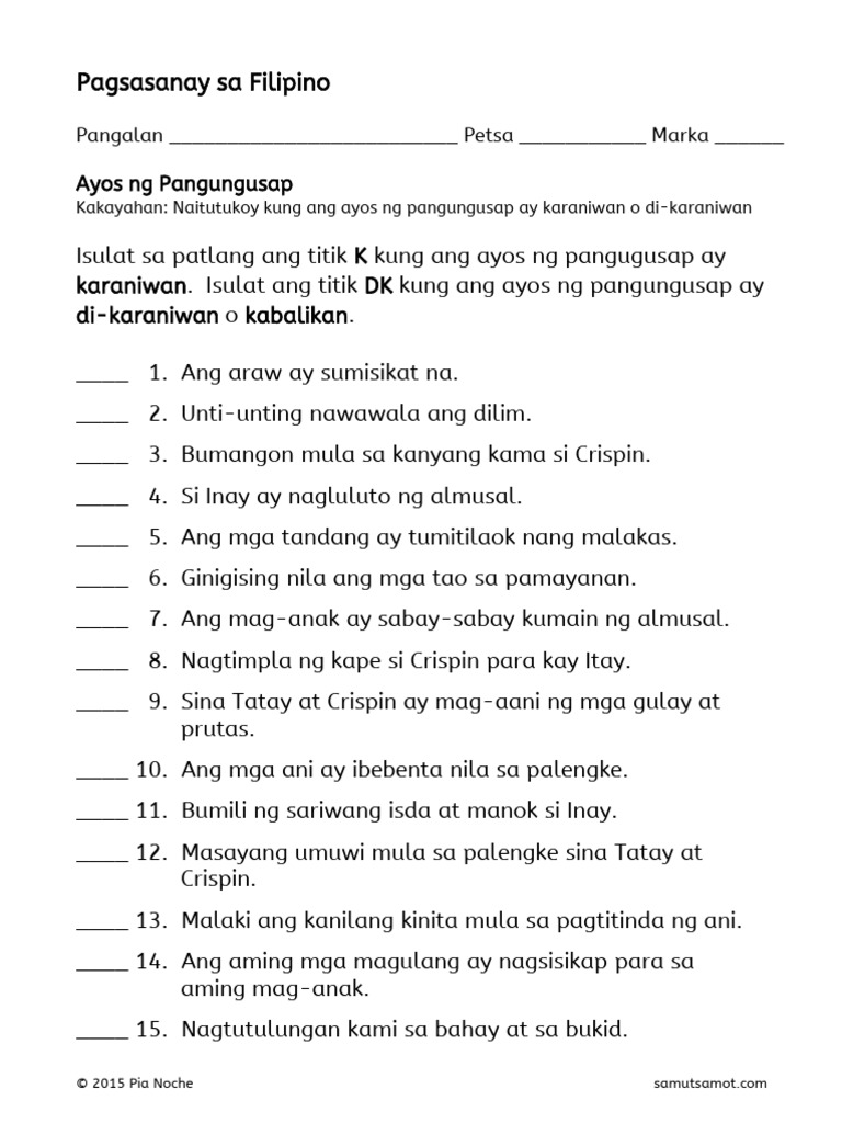 Isulat ang mga titik DK kung ang ayos ng pangungusap ay di-karaniwan o kabalikan. The five pdf worksheets below are about ayos ng pangungusap. Ayos ng Pangungusap_2.